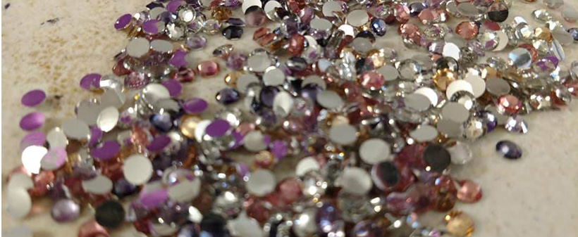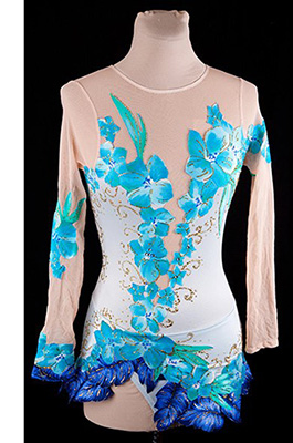 Applique is when one fabric is cut into a design, then sewn on top of another. Whether it is lettering, stars, any generic shape, or any actual logo, applique is our most popular technique for embellishing a synchro costume. Almost any stretch fabric can be appliqued onto another, with stunning results.