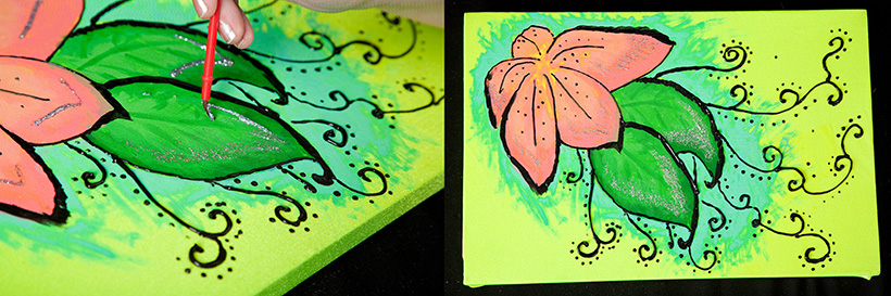 We have a special fabric paint that we use to hand paint onto lycra. When it dries, it's almost like a layer of stretchy rubber. This stuff will NOT peel, crack, or chip, and is incredibly durable. We can also use it to stencil lettering or a design onto a garment.