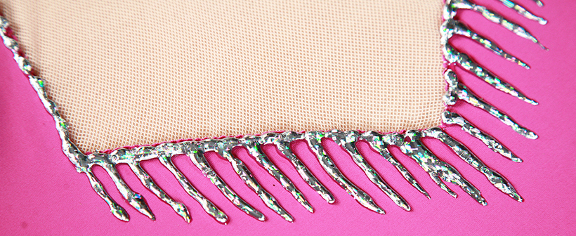 Applique is when one fabric is cut into a design, then sewn on top of another. Whether it is lettering, stars, any generic shape, or any actual logo, applique is our most popular technique for embellishing a synchro costume. Almost any stretch fabric can be appliqued onto another, with stunning results.